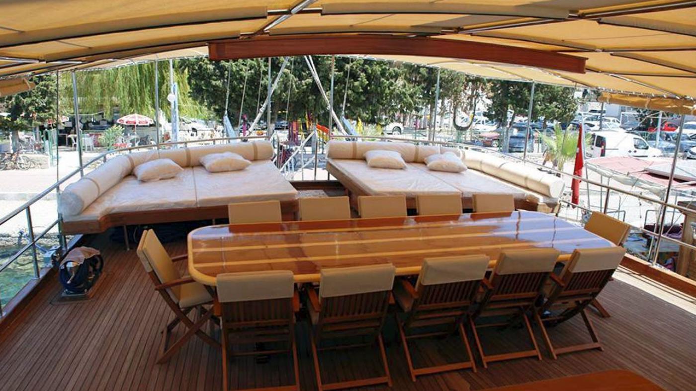 Her misafire yetecek kadar güneşlenme minderi, sandalye ve servis bulunmaktadır. Misafirlerimize konforu, lüksü ve dinginliği aynı anda yaşatmak için inşa edilen bu yat, 13 deniz miline kadar hıza ulaşabilmektedir.